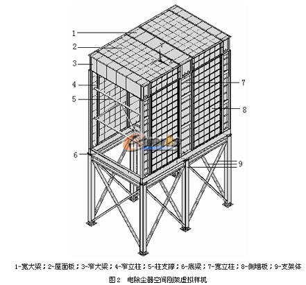 这样,由大跨度桁梁,屋面板,立柱,底梁,侧墙板,立柱支撑体和支架体组成的空间结构(图2),即可虚拟实现电除尘器的承载、密封并使其他部件在其空间安装定位。各平面刚架通过屋面板、侧墙板和底梁等纵向构件连在一起,形成一个大型虚拟空间刚架受力体系。