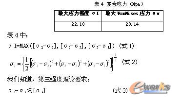 式2是第四强度理论的一个经典表达式,即在满足式2条件下,材料由于形状改变比能( ,单元体因形状改变而储存的比能)达到极限值而发生屈服。显然,该结构强度储备良好。