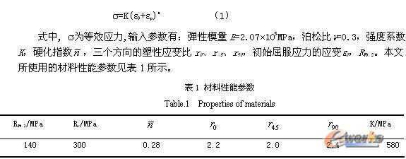 由于冷轧钢板都具有明显的各向异性,根据Hill各向异性弹塑性模型的屈服准则,选择DYNAFORM中可以设置各向异性参数的36号三参数弹塑性材料模型[2],其等效应力-应变关系[1、2]:
