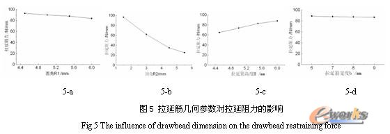 对于大型复杂形状零件的冲压成形,为了保证尺寸、形状精度及足够的刚性要求一般采用对毛坯施加适当的附加拉力的成形方法,以增加板料中的拉应力、控制材料的流动、避免起皱,拉延筋是实现这种要求的有效手段。通过设置拉延筋,①能方便有效地实现对材料流动的控制。②增加进料阻力,使拉深部位的坯料承受足够的拉应力,提高拉深件的刚度和减少由于回弹而产生的扭曲、松弛、波纹及收缩等缺陷;③靠压料面和拉延筋来控制各处的压边力,可以扩大压边力的调节范围;④降低对压料面制造精度的要求。同时,由于拉延筋的存在增加了压边圈与凹模压料面间的间隙,使压料面的磨损减少,从而提高了它的使用寿命。通过模拟分析,找出各参数与拉延阻力之间的关系,各参数对拉延阻力的影响见图5,从图中可以看出随着筋高h的增大,拉延阻力增大,随着筋宽b的增大,拉延抗力减小。拉延筋各几何参数中对拉延阻力影响最大的是圆角R2,然后依次是圆角R1,筋高h,筋宽b。并且圆角R2对拉延阻力的影响是几倍甚至十几倍,所以如果想在大范围内调整拉延阻力,就可以通过调整圆角R2的大小来实现。筋宽b对拉延阻力的影响最小,并且对拉延阻力的影响不大,如果要在小范围内调整拉延阻力的大小,可以通过调整这个参数来实现。