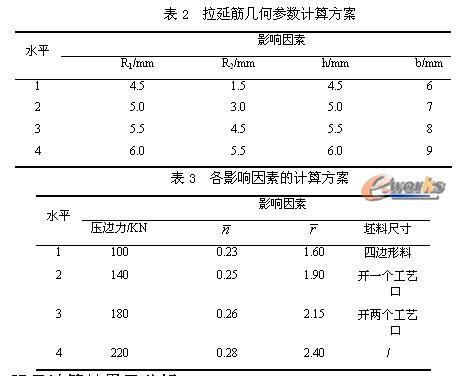 由于冲压过程的影响因素较复杂,笔者重点考虑了拉延筋几何参数、坯料尺寸、压边力、材料参数( 、 值)等多种因素对计算结果的影响,设计了四水平四因素的计算方案,见表2、表3。