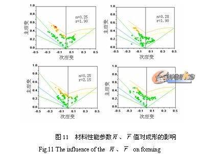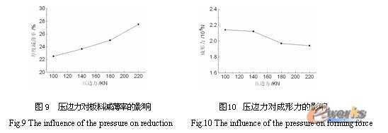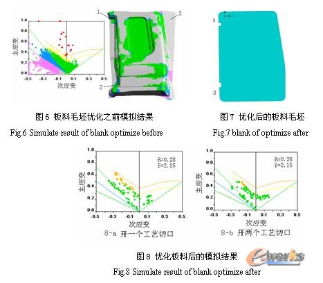 | | 3.2 板料毛坯形状的优化及对成形的影响 在覆盖件成形过程中,坯料的形状和尺寸对成形影响非常大,合理的毛坯形状对拉延成形工艺具有重要意义。图6为板料毛坯优化之前的模拟结果,从图中可以看到,在1、2号部位零件已经开裂,此处是局部压制深度较大的鼓包,材料由于难以得到其他部位材料的补充而容易破裂。解决这一问题的有效办法就是在坯料的适当部位开工艺切口,使易于破裂的区域能够从相邻的其它部位得到材料补充。3号部位板料多余部分太多,不利于材料流动,必须进行适当的减除。图7为优化后的毛坯形状,其中1、2为两个工艺切口位置。图8是优化后的板料模拟结果,从图8-b的FLD中可以看出,开两个工艺切口板料流动顺利,没有再出现开裂。  3.3 压边力的优化 不改变其他工艺参数以及板料性能参数,分别设置压边力为100KN、140KN、180KN、220KN进行数值模拟,图9和图10是压边力对板料成形的厚度减薄率、成形力的影响。可以看出,随着压边力的增大,板料厚度的减薄率增大。随着压边力的增大,成形力逐渐减小。综合几个参数,认为在此工艺参数条件下,压边力为180KN时比较适合成形。 3.4 材料性能参数对成形的影响 用上述工艺条件下的拉延筋方式,压边力为180KN,改变材料性能参数 、 值,计算结果如图10~11所示。可以看出,随着塑性应变比 的增大,板厚度减薄率逐渐减小; 值的大小反映了薄板成形时厚向变形发展的难易程度, 越大材料愈不易减薄。所以随着 的增大,减薄率逐渐减小。从图11可以看出, 值减小使应变分布图的右半部分双拉变形的应变值增大,而 值减小使应变分布图的左半部分拉延变形的应变值增大。根据计算结果,满足零件顺利成形的最佳材料性能参数为: 0.25, 2.15   | 本文系e-works专稿,未经授权严禁转载。 | | | | 责任编辑:李翔 |