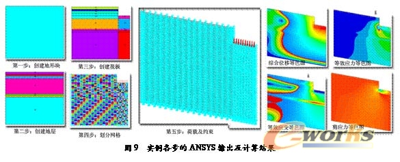 3.4 应用UIDL实现筏板基础设计向导的Main Menu设计 Main Menu下的由UIDL语言编写的菜单代码写入uimenu_rf.grn和uifunc_rf.grn两文件中。将RFDG菜单添加到原来的Main Menu下,如图2所示。通过其中的Activate RFDG Menu命令可以打开由TCL/TK编写的菜单。 4 用RFDG程序对某工程进行分析 某工程的筏板物理力学参数如表1,所受均布荷载为100kN/m2;地质资料如表2,选用D-P模型,基础计算宽度50米,计算深度45米。 表1 筏板的物理力学参数 厚度 (m) | 埋深 (m) | 宽度 (m) | 弹性模量 (MPa) | 泊松比 | 容重 (kN/m3) | 2.5 | 10 | 20 | 2.8×104 | 0.2 | 25 | 表2 某工程土层的物理力学参数 层号 | 层厚 (m) | 变形模量 (MPa) | 泊松比 | 容重 (kN/m3) | 内聚力 (KPa) | 内摩擦角 (o) | 1 | 2 | 5.5 | 0.3 | 18 | 10 | 15 | 2 | 1.5 | 6.0 | 0.39 | 19.5 | 50 | 24 | 3 | 2 | 21.0 | 0.3 | 19 | 0 | 35 | 4 | 13.5 | 30.0 | 0.3 | 19 | 0 | 40 | 5 | 1 | 6.2 | 0.39 | 19.5 | 50 | 22 | 6 | 1.5 | 23.0 | 0.3 | 19 | 0 | 36 | 7 | 23.5 | 35.0 | 0.3 | 19 | 0 | 40 | 应用RFDG程序对该工程进行分析计算,各步骤的计算结果如图9所示。可以很方便的得出整个基础的应力、应变和位移的等色图,以及基础底面的位移、应力和应变数据,且所有由RFDG程序输出的数据均可以快速的导入到Excel中。从计算的结果可以看出,在筏板板底边缘处出现应力集中现象,并且该处剪应力最大,筏板跨中下的地基垂直方向应力向下逐渐减小,垂直方向位移的最大值出现在跨中。可见其计算结果与传统的分析相吻合。  5 结论 本文以筏板基础设计向导程序及其用户菜单和界面的开发为例,探讨了ANSYS的二次开发和应用问题,并应用该程序对大型筏板基础工程实例进行了分析。分析所得结果基本可行,所编写的筏板基础设计向导程序以及应用TCL/TK、APDL、UIDL对ANSYS二次开发经验的总结,对于进一步进行筏板基础设计向导程序的开发研究具有一定的意义和参考价值。 [参考文献] [1] Brent B. Welch、崔凯译. Tcl/Tk编程权威指南[M],北京:中国电力出版社,2002.6 [2] 博弈创作室. APDL参数化有限元分析技术及其应用实例[M],北京:中国水利水电出版社,2004.2 [3] ANSYS Inc, APDL Programmer‘s Guide, SAS IP, 2003 [4] 宋勇、艾宴清、梁波等. 精通ANSYS7.0有限元分析[M],北京:清华大学出版社,2003.3 [5] 张波、盛和大. ANSYS有限元数值分析原理与工程应用[M],北京:清华大学出版社,2005.9 [6] 钱力航. 高层建筑箱形与筏形基础的设计计算[M],中国建筑工业出版社,2003.6