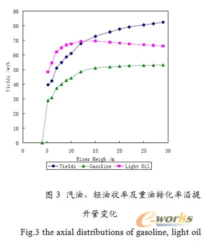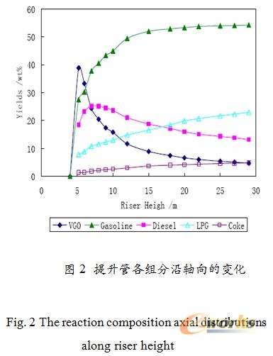 3.2.2 固相边界条件 入口条件:各物理量取均匀入口条件,给定 ,则固相入口法向速度ws=Gs/αsρs,vs=us=0。入口湍动能和湍流耗散率由经验公式: , 。温度采用绝热条件。 边壁取半滑移条件: , 出口条件取充分发展条件:   4 模拟结果与分析 图2为提升管内各组分沿轴向变化图。可以看出,重油裂化反应主要发生在喷嘴附近区域,在喷嘴附近已经有45%的重油转化为汽油和柴油(如图3所示)。在距离喷嘴12米处,重油转化率已经达到70%左右,也就是说70%的重油转化为汽油、液化气和焦炭,该模拟结果与文献[1]通过对工业提升管取样得到的结果吻合。从轻油产率来看,在距离喷嘴10m范围内,轻油收率增加幅度较大,从喷嘴附近的45%增加到68%左右,而后由于汽油的二次裂化,轻油产率逐渐下降。从重油质量分率变化来看,同样在距离喷嘴15m范围内,重油收率变化幅度较大。随轴向位置的增加,重油逐渐降低,但变化幅度较小,这主要是由于催化剂的失活所致。由以上结果可以看出,提升管喷嘴附近区域对重油催化裂化反应的影响很大,大部分反应主要发生在提升管的中下部分区域。因此,强化喷嘴区的重油雾化以及两相的接触效率无疑对重油的深度转化有一定的现实意义。   |