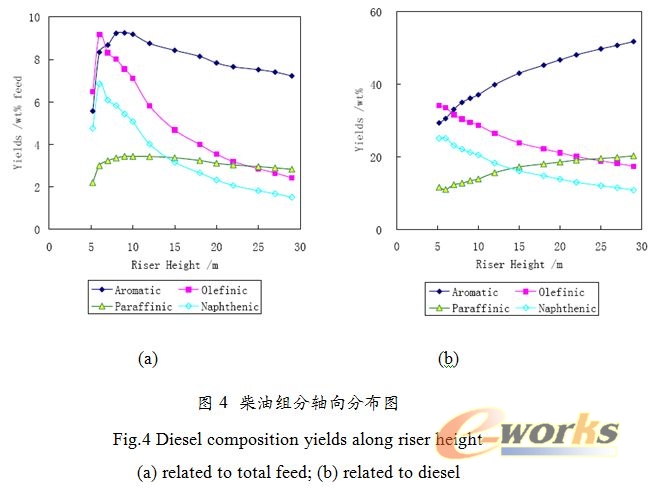 对于柴油组成而言,随着提升管轴向高度的增加,柴油中烯烃和环烷烃含量逐渐减小,烯烃含量由喷嘴区的34wt%减小到提升管出口处的17wt%左右;环烷烃含量由喷嘴区的25%降低到11%左右。在整个提升管内,柴油中芳烃含量一直增加,提升管出口处柴油中的芳烃含量为50%左右。