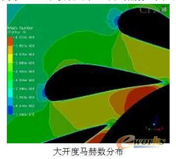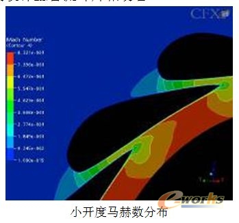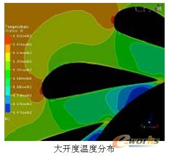 喷嘴环叶片前缘附近,大开度时,喷嘴环流通面积较大,具有相当厚度的前缘对气流阻挡明显,使气流在此处滞止,使得相对压力较高,即喷嘴环叶片前缘逆流部分压力比周围压力要高;而小开度时,流通面积较小,气流在近似平行的两平板间流通,前缘对其流动几乎不存在影响。