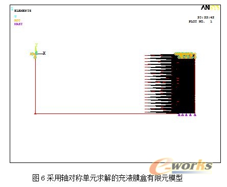 采用模态提取方法中的缩减法进行求解,主自由度选取膜盒端面的流体自由度。在求解中根据平衡后的膜盒高度进行建模,即尽量使得刚度矩阵与实际状态接近。有限元模型图见图6。