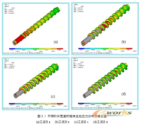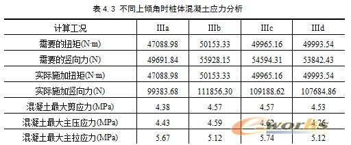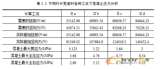 在叶片宽度变化的四种工况中,随着叶片宽度的增大,桩体旋进所需要的扭矩越来越大,所需要的竖向力也越来越大。三种应力随叶片宽度的增大而增大。由图3.1可知,主拉应力超过混凝土抗拉设计强度的范围随叶片宽度的增大而向下延伸,并且在叶片与桩芯连接部位的影响范围也随之扩大;桩芯外表面剪应力均未超过混凝土的强度,而从工况Ⅱc到工况Ⅱd在叶片与桩芯连接部位的剪应力在增大。