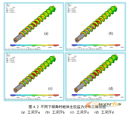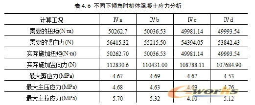 根据计算机建模可知,上倾角不能超过70°,工况Ⅱb和工况Ⅱd的主拉应力相等且为四种工况中最小,虽然工况Ⅱa的最大剪应力值为四种工况中最小值,但其主拉应力比Ⅱb和Ⅱd的要大, 工况Ⅱd的最大剪应力比工况Ⅱb的稍小一点。从图4.1可以看出,工况Ⅲd的最大主应力超出混凝土抗拉设计强度的范围比工况Ⅲc的要少。但从数值上来看,四种工况的三种最大应力变化幅度不大,所以,上倾角的变化对桩体应力状态的影响不是很大。
