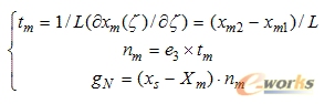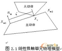 接触模型的法向矢量、切向矢量和主从体之间的接触距离可以分别表示为: