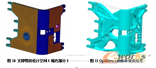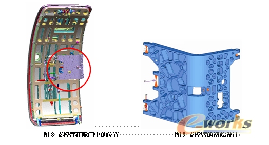 《一》、概念设计阶段的主要目的是得到舱门支撑臂的全新设计思路,这可以通过OptiStruct的拓扑优化技术实现。首先根据支撑臂的安装位置、运动轨迹和连接关系确定设计空间,然后建立主要工况,包括舱门关闭、紧急打开和气阀撞击三种工况,将这些工况下的结构刚度指标作为设计约束。设计目标为重量最小。同时,在优化过程中考虑了拔模方向,以满足铸造工艺要求。根据OptiStuct给出的设计思路,设计工程师就可以初步设计出支撑臂的结构。