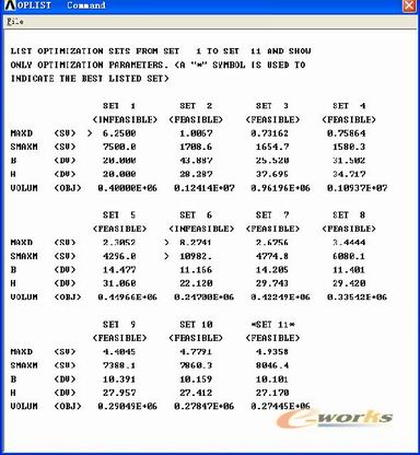 以上实例的运算使用了作者自行编制的优化程序模块,从结果来看,基本实现了对矩形截面量在各种载荷条件下尺寸的优化。使用该程序可以实现的优化种类有:两端铰支(超静定)矩形梁在任何点作用集中力或在整个梁上作用分布力;一端固支的矩形梁在任何点作用集中力或整个梁上作用分布力等两类四种载荷梁的优化。该程序模块的优点是:1.采用交互式的操作界面使得优化过程操作简单化2.对于APDL用户来说该程序的有较灵活的修改特性。不足之处在于,程序中梁的截面形状必须是矩形的,再者程序中的优化设计变量状态变量的数目都是确定的,具体到实际应用中还需要做大量的工作。