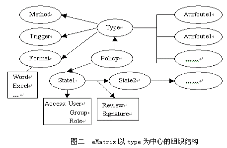 eMatrix系统中并未建立类层次结构,它主要以类型(type)为中心,通过为type添加属性(Attribute)、编写方法(Method)和触发器(Trigger)、制订合适的政策(Policy)等来组织整个系统,其中政策规定了各type所能拥有的数据文件格式(如word、excel等)和该类对象所拥有的生命周期——生命周期由多个状态(state)组成,对象的状态间转换需要通过审核签署。用户(user)所拥有的操作访问权限随着对象状态的改变而发生变化。eMatrix中以type为中心的信息模型清晰的反映了系统组织模式。