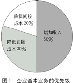 信息技术与传统制造业相结合是中国大多数制造业企业的必由之路,但在今天,大多数企业在应对迫在眉睫的商业挑战时,在调整那些令人混淆不清的信息化技术的过程中,曾经出现过巨大的错位和决策失误。 让我们首先了解一下企业基本业务的优先级。一般来说,企业基本业务的优先级首先是增加收入,这是企业决策层最关心的问题,约占50%优先度;其次是降低直接成本,约占30%;最后是降低间接成本,约占20%(图1)。
