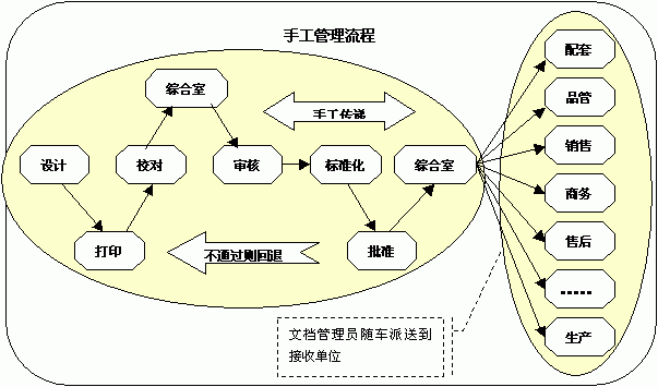 厦门金龙旅行车有限公司俗称小金龙,年产值26个亿,经营模式与大金龙有十分相似之处,但小金龙工厂分散在四个不同的区域,各自相隔30到40公里,由于各个工厂生产的特殊性,依然是集中管理:技术部门(汽车研究所分布在岛外)、财务部、销售和售后服务部(岛内)统一,分厂有独立的生产、车间、工艺和技术组。这种分散生产、集中管理的情况给小金龙技术管理工作与信息交付带来了极大的麻烦和繁重的工作量,在手工管理状态下,设计者完成设计后各自打印出图纸与技术通知单,提交部门内校对和审核后递送综合管理室。由于受工厂地理分布的影响,综合管理室管理员做法往往是积下了好几份单据,然后提交给部门经理和总工批准后一起发放,这样有两个明显的弊端,其一,由于按定单方式生产,在技术通知单的传递速度相当缓慢的情况下直接影响生产效率,交货期严重滞后。其二,如果传递的技术通知单在较多并且较急的情况下,批准流于形式,导致生产的浪费,造成了直接经济损失。其三、过程中存在大量冗余活动,生产部门无法及时准确反馈变化信息,而设计部门无法控制生产部门的更改,更改缺乏记录,出现错误相互扯皮。从下图我们不难看出,在信息传递过程中,综合室成为信息传递的主体,无论哪个部门所产生的技术通知单都统一提交到综合室进行汇总,由综合室提交领导审批,然后复印下发。综合室成为信息集中和发散的中枢。据统计,一份技术通知单从拟制到发放至所有接收单位,最少耗费的时间也在2-3天,这其中并不包含退回情况。不言而喻,对于一个以定单主的生产型企业来说,这种情况将直接影响生产的效率,信息传递的准确和及时。