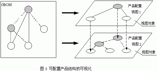 为了使产品的配置过程更加直观,产品数据管理采用视图控制法来对产品配置的不同视图进行描述和管理,如图3所示。每一个视图是一个管理对象,视图中可以包括原材料、半成品、零件、部件等构件及它们之间的关系,这些构件可以同时与多个视图相关联,不同视图间的区别在于构件集合的不同以及构件间关系的不同。从一个产品配置视图可以产生另一个产品配置视图,视图间的转换是通过筛选、复制,修改等操作完成的。每个从GBOM中派生出来的产品配置都有自己的视图对象,表示一个具体的产品配置。