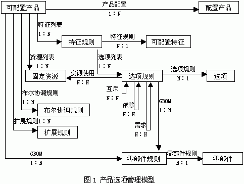 通用的产品选项管理模型如图1所示,产品选项管理首先为企业产品创建产品结构、规则和GBOM,用GBOM和为产品定义的规则验证产品配置和创建精确BOM: