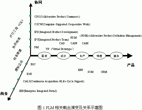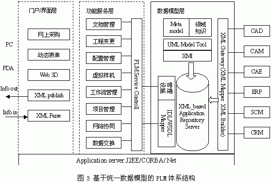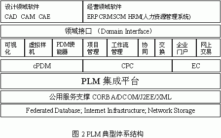 | | 1、引 言 信息技术在企业的应用主要体现在设计与生产两大环节,设计阶段代表性的技术是CAD和PDM,生产阶段则以ERP及相关技术为主导。从产品的整个生命周期来看,产品的成本耗费约80%是在研发阶段决定的,企业实力的增强、核心竞争力的提升要求企业把更多的精力集中在研发阶段的产品创新,而不是只通过ERP系统的应用在制造环节精打细算。产品全生命周期管理(Product Life cycle Management, PLM)从产品设计入手,关注产品从需求分析到设计、制造、销售、使用、报废的整个过程,围绕产品这个核心进行信息管理,能有效提高企业的竞争能力,从而成为企业信息化领域新的突破点。 2、PLM基本概念 PLM的概念的提出经历了一个发展过程,它是企业生产方式发生改变后对支撑技术环境所提出的一种需求。随着并行工程(CE)、协同制造等工作方式的成熟,动态联盟和虚拟企业成为企业运行模式的发展趋势,这要求企业内部、企业之间能够围绕产品进行信息系统的构造和配置。  目前有关企业信息系统的概念和技术很多,我们可以从商务、协同、产品几个方面进行分类。在商务执行手段上,电子商务(B2C、B2B)、计算机支持下的连续采办和生命周期支持(CALS)已在实际中得到具体应用。在企业协同方面,集成化产品开发团队(IPT)、集成化团队开发(IPD)、计算机支持的协同工作环境(CSCW)等理念和工作方式成为指导企业进行产品开发的标准规范,并进一步发展到综合产品各项活动的协同产品商务(CPC)。对比以上概念,PLM以产品的整个生命周期过程为主线,在产品数据管理(PDM)、协同产品定义管理(cPDM)的基础上,融合CPC中的协同工作模式和协同工具,并有效集成CAD/CAM、ERP/SCM/CRM等应用系统,从而成为支持企业运行的统一的集成平台。在此平台上,PLM提供企业间的应用集成方法,通过企业集成门户(EIP)支持企业间信息交互和电子商务活动的开展。 3、PLM体系结构及关键技术 3.1典型体系结构 目前,已有一些研究公司或机构推出自己的PLM系统,如IBM的CATIAV5R8;SAP公司的mySAP PLM[1];EDS公司的TeamCenter等[2],典型的PLM体系结构如下:  PLM系统功能从总体上可分成三类,支持并行设计和协同开发的cPDM;协同产品商务支撑平台及辅助工具CPC;实现电子商务功能的使能器和门户。在每一大类中包含若干相对独立的功能单元,这些单元可能表现为一种工具,如可视化,也可能表现为相对独立的子系统,如项目管理和工作流管理。功能单元之间的互操作一般基于分布式对象技术,其中CORBA因其良好的跨平台性和对异构系统的整合能力而成为主流的集成技术,在CORBA平台之上,各种应用通过IDL描述其所能提供的服务并实现互操作。在系统互操作方面,随着网络计算技术的发展,Web Services可能成为下一代的集成框架标准。在数据交换方式上,一些产品如PTC公司的Windchill,引入XML实现企业应用系统之间的数据传递与解析。在永久数据类型的管理上,PLM数据组织方式相对复杂,要求系统提供联邦数据库机制,以实现在互联网环境下的数据分布与集成。 通过领域接口,PLM实现与应用系统的集成。目前有很多组织致力于CAD/ERP等系统的标准化工作,如OMG在其领域接口中定义了CAD、PDM、SCM等应用系统接口的IDL描述,为PLM与应用系统的集成提供了可资参考的标准。 4、关键技术 PLM中涉及的技术很多,包括:并行工程技术(集成框架、CSCW、CAX、DFX、IPT、约束问题求解);虚拟制造技术(visualization、数字样机、虚拟现实);集成产品开发技术(IPT、IPD、IPPD);项目管理技术(WBS分解、项目资源、工作流);统一数据模型技术(产品建模、模型交换)等[3]。在上述各种技术中,目前的难点有数字样机技术和统一数据模型技术,前者有很多机构在研究,而后者则未引起足够重视。 数字样机以CAD技术为基础,是一种基于计算机仿真模型的数字化设计方法。在产品环境模型支持下的虚拟环境下,通过产品模型库相关产品开发工具(CAX/DFX工具、外观/功能/行为建模工具等)或已有相关产品模型(CAD模型、外观表示模型、性能仿真模型等)构造产品的数字样机,并根据需求对模型进行模拟分析,进而根据分析结果,在模型的VV&A过程支持下,修改产品设计模型和相应的仿真分析模型[4]。在建模和分析的过程中,可能有多个企业参与活动,这些企业采用的CAD环境往往不同,如何在统一平台下进行虚拟装配是最大的难题。在早期的CAD图形交换标准中,STEP曾有很大影响,各种CAD系统通过STEP中型文件进行交互,但STEP在实际应用中效果并不理想,原因主要是采用文本格式描述的中间文件组织繁琐,但又不能精确表达模型的几何信息与结构信息。目前EDS的EAI平台推出JT这种中间文件格式,它能够保留产品模型必要的几何信息和装配信息,过滤与数字样机无关的其它信息,为虚拟装配实现提供了可行的解决方案。 统一数据模型的建立对PLM系统的实现具有重要意义。PLM系统的运做与执行涉及到产品设计与生产的各个方面,与企业资源、产品数据、管理模式、供应商、客户等信息密切相关,而目前通过集成框架的信息集成方法存在的缺点明显:缺乏信息模型的统一规划,难以做到企业资源的统一调度,只是实现了关联数据在分系统间的传递与交互。实际运行的企业是一个高度复杂的系统,只有把整个企业作为统一整体进行考虑,才能实现信息最终的有效集成。在现有PLM体系结构的基础上,本文提出基