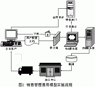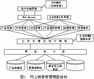 网上销售管理通用模型作为一个独立系统,实现与企业PDM系统的紧密集成,以企业产品为中心,借助计算机网络和数据库技术,把企业销售过程与设计、生产过程中所有与产品相关的信息和过程集成起来,进行统一管理,实现数据共享和过程协同。
