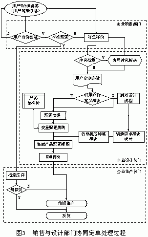 ⑵ 销售部门首先从Web服务器上获取客户提交的注册信息,与客户取得联系,进行用户身份验证。验证合法,与设计部门协同进行订单配置有效性、经济性确认。确认可行,与客户签订销售订单。