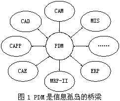 随着网络技术的飞速发展和信息化时代的到来,企业信息化建设已逐步深入到企业内部,以及企业内部与外部之间的联系之中。如何在企业中建立起越来越多的业务应用系统,整合企业的现有IT资源,使企业中计算机孤岛式的应用向集体协作的方向发展,以业务过程为中心进行应用系统的集成,最大程度地发挥各种资源的效益,提高业务各环节间的响应速度,降低企业成本等等问题现在正在逐渐成为企业关注的焦点。要实现企业信息化的建设,关键就是要实现企业的信息集成与共享,包括不同部门间、企业内部与外部间及企业同企业间的信息集成和共享,解决企业“信息孤岛”,而PDM(产品数据管理)技术正是在这种情况下应运而生的。PDM的迅速发展正迎合了企业在使用计算机不断深化的运用过程中的需求,是企业实现设计部门和其它管理部门的桥梁,如图1。