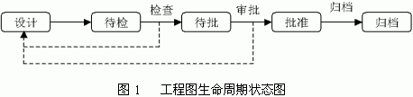 产品数据管理是一种面向对象的信息系统,它将所有与产品相关的信息和过程定义为对象,如文档、工程图、关系和过程等。对象在其生命周期中要发生许多变化,如版本、所有权、访问权等。在生命周期的不同阶段,对这些变化有不同的控制要求。工程图对象的生命周期状态如图1所示。