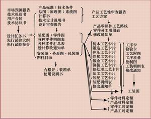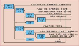 PDM对CAD系统输出的图纸、模型、技术文件与产品设计、工艺设计各工作过程进行管理。产品设计是一个过程,少的要几十天,多的要几个月,产品数据在这一过程中逐步形成,为了缩短技术准备周期,必须对过程进行控制,一般称生产技术准备计划。图3是产品设计与工艺设计各阶段技术文件、图纸、资料的关系。根据这些关系可以研究产品设计、工艺设计各工作阶段对图纸、资料、技术文件的需求,从而研究开展并行工程的应用。图4是生产技术准备计划控制产品设计与工艺设计的过程,也说明了PDM系统在产品设计、工艺设计过程中对产品数据分阶段逐步形成的过程进行管理,称为项目与流程管理。