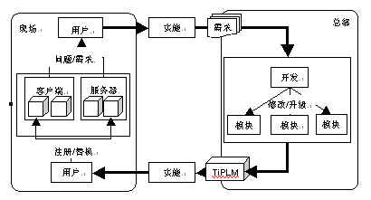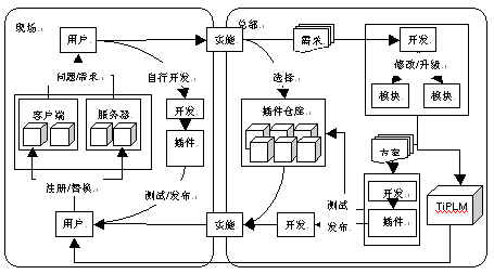 首先,用户和实施人员通过TiPLM系统的定制功能解决企业的模型定制需求。在实施过程中当企业提出新的个性化要求时,实施人员根据企业需求从总部的现有插件库中选择适合需要的插件然后通过注册的方式满足该企业的要求。如果现有插件不能满足需求,对于具备一定开发能力的企业可由企业的开发人员通过插件框架机制或TiPLM SDK进行新功能的开发,满足企业个性化的要求;如果企业不具备这样的开发能力,也可由开发商的开发团队通过插件框架或TiPLM SDK进行开发以满足企业所提出的需求;如果新需求无法在现有系统上通过二次开发的方式来支持,则需要通过软件开发商修改系统主体版本的方式解决,然后利用自动升级服务完成软件的部署工作。
