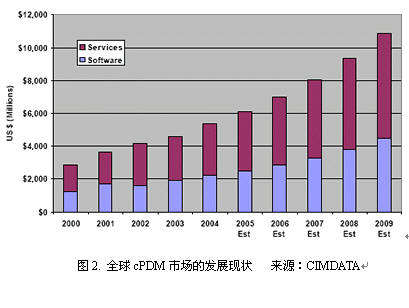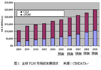 根据CIMDATA于2005年4月发展的研究报告,2004年度全球PLM市场为160亿美元,2003年增长10%,预计到2009年的平均复合增长率为8%,达到250亿美元。因此,这是一个迅速发展的领域。如图1所示。