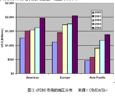 从地区分布来看,欧洲与美洲的cPDM软件营业额基本相当,亚太地区略低一些。但是,亚太地区的cPDM市场增长更为迅速,如图3所示。