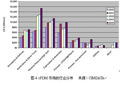 从行业分布来看,汽车与各类交通工具行业cPDM应用最为广泛,其次是电子、机械制造、航空和国防。在流程行业中的包装、食品应了和制药行业、石化等行业也有一定应用。这也就是说,PLM技术整体上在离散制造业的应用要远远多于流程制造业。如图4所示。