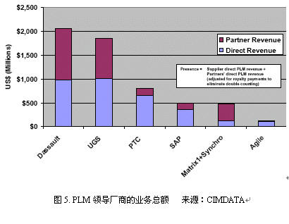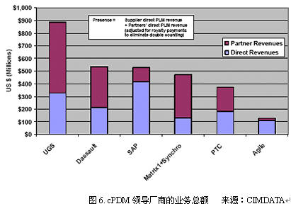 全球cPDM领导厂商的业务总额如图6所示。红色的表示合作伙伴的营业额,蓝色表示厂商自身的营业额。有趣的是,ERP巨头SAP的cPDM相关收入处于第一位。而UGS及其合作伙伴的总体营业额居首位。同时也可以看出,对于从CAD领域发源的PLM厂商UGS,Dassault和PTC,其管理软件收入(如UGS的Teamcenter和PTC的Windchill)仍然低于工具类软件(如UGS的UG NX和PTC的PROE)收入。Matrix One和Agile是PLM领域的后起之秀,他们没有自己的CAD解决方案,被称为中性的PLM厂商。最近,Agile收购了提供图形浏览和会签工具的加拿大软件企业Symmetry,从而进一步提升了对各类CAX软件的浏览和管理能力。实际上,ERP领域的ORACLE、IFS和SSA(收购了BAAN公司)等厂商也提供了PLM解决方案,由此可以看出,PLM领域是当前企业信息化的热点和重点,ERP厂商也开始进军这一领域,ERP厂商的PLM解决方案能够很好地解决与自身ERP软件的信息集成问题,在BOM信息管理方面功能较强,但功能相对简单,图档管理功能较弱。