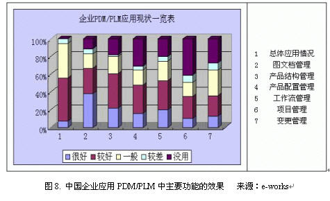 中国企业应用PDM软件大体上是从1997年开始的,而PLM的理念和软件在中国的出现是从2001年开始的。到目前为止,国内外软件厂商提供的PLM软件还处于发展过程之中,并不具备PLM理念中所应当具备的所有功能,大多数软件实质上还只具备PDM软件功能。因此,中国制造企业应用PDM和PLM技术是在企业自身对需求不是很明确,而PDM和PLM技术又不是很成熟的技术上进行的,因此,与ERP在中国的实施应用一样,PLM在中国的总体实施效果也并不理想,大多数企业只实现了部分模块的应用。