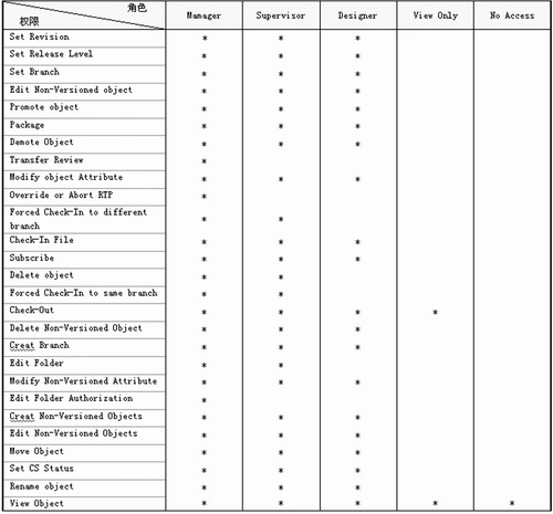 (3)角色和权限的定义。根据设计部门需要,我们设立了5个角色 :Mamager 管理员、Supervisor 项目负责人、Designer 设计人员、View Only 只读和No Access 无访问权。