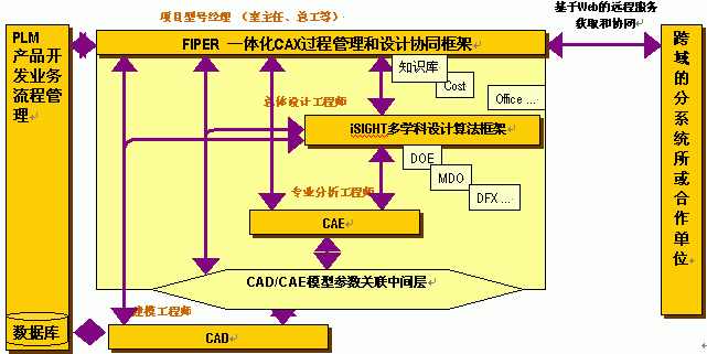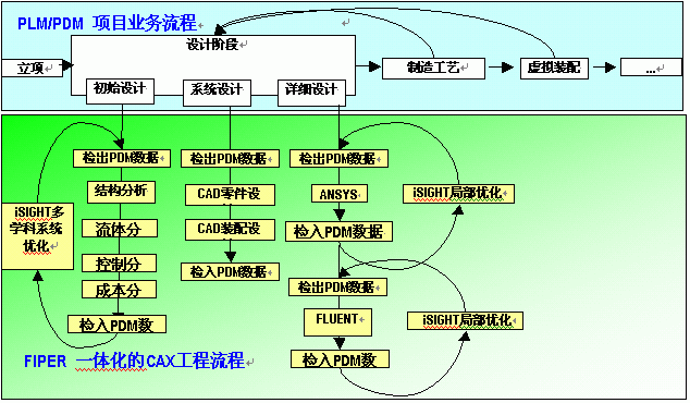 总之,通过FIPER与PDM实现CAX数据和过程相融合的统一产品开发平台,适用于产品研制阶段的CAX工程数据和工程过程的集成和优化,一方面能够有效地整合企业内各CAX软件和硬件计算资源,提高设计效率以增强对市场需求的快速反应能力,另一方面也加强企业的自主设计能力、以及整体协作能力,可以进一步提高企业的产品质量,缩短产品研制周期,降低研制成本,并为企业未来的快速发展奠定坚实的技术基础。