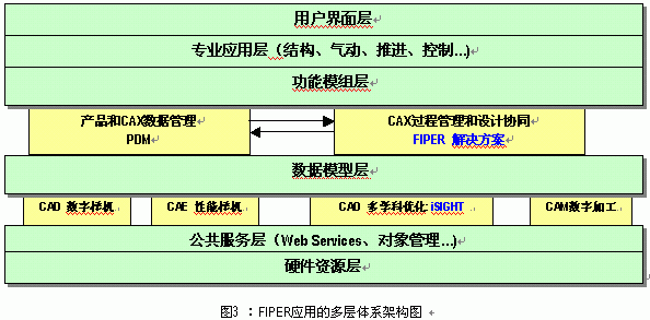 FIPER基于高可扩展性的J2EE多层体系架构,图2是FIPER的多层体系架构下的解决方案示意图,而图3显示了FIPER在建立复杂的专业应用平台系统中的定位。通过FIPER技术构成融合CAX数据和过程的产品开发平台,可以有效地为PDM集成CAX工程数据、清晰地将CAX工程过程融入产品开发全生命周期,让CAX设计工具和设计技术更灵活的适应产品开发的不断变化;从而为管理者提供一个更高效的技术管理窗口,为开发人员提供更方便的设计工具和知识库,最终,大大加快新产品开发速度,提高产品品质,协助企业取得新的竞争优势。