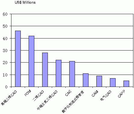 2004年,中国高端三维CAD的市场总额为4600多万美元(3.8亿人民币)。达索系统的CATIA、UGS的UG NX和PTC公司的Pro/Engineer(高端应用部分)占据了几乎100%的市场份额。中端三维CAD的市场为2200多万美元(1.82亿人民币),SolidWorks, Solid Edge和Inventor,以及Pro/Engineer野火版(中端应用)占据了约90%的市场份额,我国的CAXA三维实体设计软件、新洲协同公司的Solid3000三维造型软件也拥有较为广泛的客户群,而TopSolid、VX CAD等国外厂商也在中国发展了一批用户。中端三维CAD厂商的主要策略是迎接数以百万记的从二维CAD转向三维CAD的机会。越来越的主机厂商将带动他们的供应商转换为三维CAD软件。中端三维CAD的市场增长迅速,造型技术,尤其在曲面造型、各类应用模块的增加、软件的易用性方面成为厂商之间竞争的焦点。