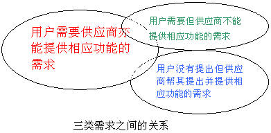 对于某个特定企业的需求,如果使用不同的PDM系统来实现,有些产品相对来说灵活一些,能解决的需求肯定就多一些;而对于那些灵活性稍差的系统,能解决的需求就少一些。即使是相同的需求,在各种因素不同时,其划分亦不相同。比如说,由于项目进展顺利,原本“用户需要但供应商不能提供相应功能的需求”可能会变成“用户需要供应商亦能提供相应功能的需求”。因此,对于企业需求的分类,也非一成不变,它需要经验丰富的项目经理在充分综合项目金额、供应商对项目的重视度、实施计划、企业信息化现状等各种因素后确定,而且,随着项目实施的进度的改变,剩下未实现的需求的分类还可能会动态改变。他们之间的关系我们可以用下图来表示: