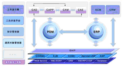 首先实现对各个单元应用系统的集成,有效管理应用系统产生的信息,提供应用系统之间的信息传递和交换的平台。如图所示的PDM集成框架图,它采用通用组件技术,以企业应用集成平台为支撑,提供开放式的通用集成工具集(如工作流引擎、二次开发平台和知识管理器等),将产品设计、分析、制造、工艺规划和质量管理等方面的信息孤岛集成在一起,形成贯穿企业全局的信息流。CAD/CAPP/CAM/CAE系统从PDM中提取各自所需的信息(如组织、产品数据、过程信息等),也可以将设计结果存储到PDM中,ERP借助PDM的信息桥梁作用疏通与4C的信息梗阻。PDM把设计所产生的EBOM(设计物流清单)、PBOM(制造物流清单)、Routing(工艺路线)等信息传递给ERP系统;而ERP系统中生成的与产品有关的生产计划、材料、维修服务等信息,也可被PDM管理、利用、传递。