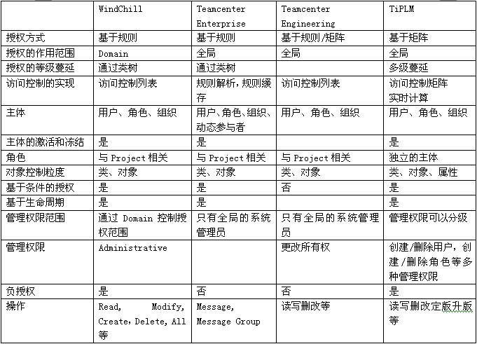 表1给出了几个主流PDM/PLM系统授权模型的比较。下面主要介绍一下这些系统在授权模型方面比较有特色的地方。