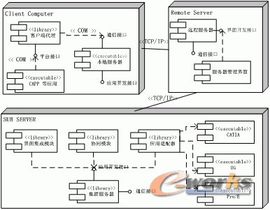 (1) 代理 安装在客户端,以动态连接库(DLL)的形式存在,提供给客户(CAD/CAPP/PDM/BOM等)调用集成平台功能的接口。代理在使用时,加载进入客户程序进程,代表客户程序与本地服务器进行通信,并接收、过滤、分发传递给客户程序的集成和协同消息。对平台或者客户端程序而言,彼此的内部结构是不可见的,仅需要同代理交互,就可完成集成和协同。这为集成平台的功能扩充和内部结构的变化提供了便捷。完成部署后,集成平台可以独立的升级、变化,而无需改变客户端程序。