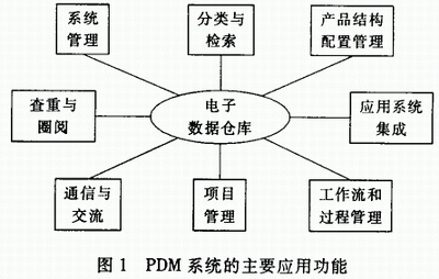 PDM系统包含的主要应用功能有:文档控制、产品结构与配置管理、工作流与过程管理、项目管理、信息分类与检索、应用系统集成、变更控制等,它提供产品设计、制造和技术支持服务所需的大量数据跟踪与存储功能,进而控制产品信息的处理和使用,管理产品的开发过程,见图1。