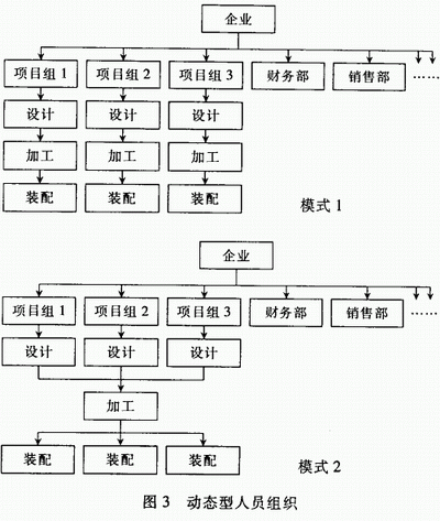 (2)动态型:即产品开发按照项目组织人员,每一组人员中包括完成某一特定模具开发所需要的所有设计、工艺、生产、管理、售后服务人员。随着项目转型,人员也相对变化。工作流程在组内以串行为主,对企业则以并行为主,企业的销售、行政、财务等非生产部门则相对固定。在生产的安排上又可分为按照单一产品完成整个产品的制造;以及集中加工,按产品分组装配两种方式,见图3。