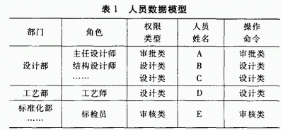 虽然不同企业的人员组织不同,但其角色设定及权限设定是大致相同的。因此,当企业的人员组织结构确定之后,即可确定人员数据模型。人员数据模型可用表格描述间,根据图2建立的人员数据表见表1。