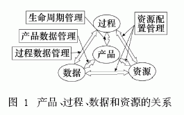 PDM进行信息管理的两条主线是静态的产品结构和动态的产品设计流程,所有的信息组织和资源管理都是围绕产品设计展开的,这也是PDM系统有别于其他的信息管理系统,如管理信息系统(M IS) 、物料管理系统(MRP) 、项目管理系统( ProjectManagement)的关键所在。PDM系统中数据、过程、资源和产品之间的关系如图1所示。