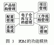 目前,各种商品化的PDM软件产品大同小异,大体具有以下主要功能(如图3所示) 。