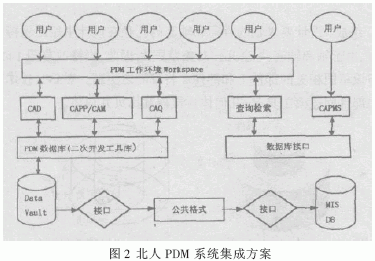 PDM是八十年代出现的新技术,历经20多年的发展日趋成熟。在美国,近50%的企业应用PDM 技术。在我国也有10多年的研究,并被很多企业运用,取得良好的经济效益。如:北京北人印刷机械股份有限公司是国有企业中第一个应用PDM作为集成平台的企业,其PDM系统集成方案如图2,该系统将CAD、CAPP、CAM等系统进行封装,由PDM对其进行权限和数据管理,从而实现设计信息的集成。由于PDM侧重于设计信息的管理,对生产库存采购的管理则通过MIS系统管理,两个系统的数据结构不一样,数据交换可以通过数据接口的形式来实现。在此环境下,新产品开发改变了原产品开发人员的组织方式,由行政科室(设计科、工艺科、标准化室) 改为以产品为单位,由设计、工艺、标准化等人员组成的项目组。使设计工艺标准化审核等工作打破了行政组织,减少了行政部门之间的信息不畅。