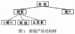 机械产品设计中, 产品模型是一个层次结构, 包括产品、部件、组件和零件。该层次结构可用一种根部在上倒置的树状图来表示, 如图1 所示是一眼镜产品的结构树。为了便于计算机识别, 必须把产品结构图转换成规范的数据格式, 这种用规范的数据格式来描述产品结构的文件就是物料清单(BOM)。它主要包括制造BOM、计划BOM和成本BOM。就其本质而言,BOM 是一种反映产品结构的技术文件,反映了产品与零部件间层次关系, 包括构成父件的所有子件及其原材料信息, 有关产品及其零部件的编码、规格、材料等信息。在任何制造环境中, 各部门都要从文件中获取特定的数据, 以指导生产。