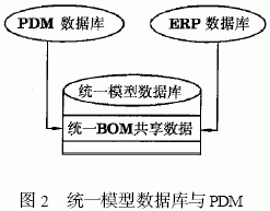 可以看出, 统一模型数据库是PDM系统数据库和ERP系统数据库的并集, 二者的交集就是统一BOM 表和2 个系统的共享数据模型。