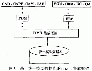 CMS 系统的应用集成框架基于统一模型数据库, 支持PDM 系统和ERP 系统的各种应用软件的集成。通过企业级PDM 系统可以实现CAD,CAPP, CAM , CA E 等CAX 应用软件的集成。企业级ERP 系统的扩充与延伸可以与CRM , SCM , EC,OA 等系统实现集成。所以, CMS 系统的应用集成框架主要为PDM 系统和ERP系统的集成提供标准接口。基于统一模型数据库的CMS 集成框架如图3 所示。PDM 系统和ERP 系统可以保留各自的数据库, 通过CMS 集成框架实现PDM 系统数据库和ERP 系统数据库与统一模型数据库的同步更新, 保持数据的完整性与一致性。